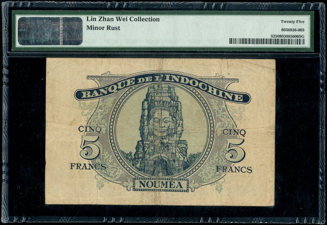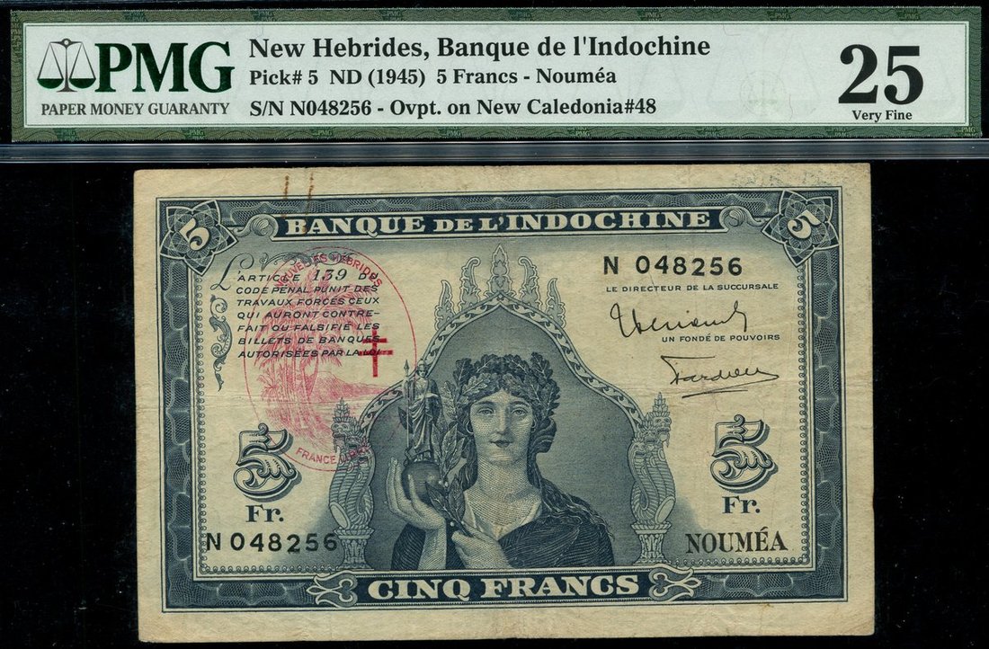 (x) New Hebrides, Banque de l'Indochine, 5 francs, ND (1945), serial number N 048256, blue, woman wearing oak leaf wreath, holding laurels and small statue of Athena on globe at centre, snakes/dragons at left and right, oval red NOUVELLES HÉBRIDES FRANCE LIBRE overprint at upper left, reverse, face sculpture at Bayon temple of Angkor Thom