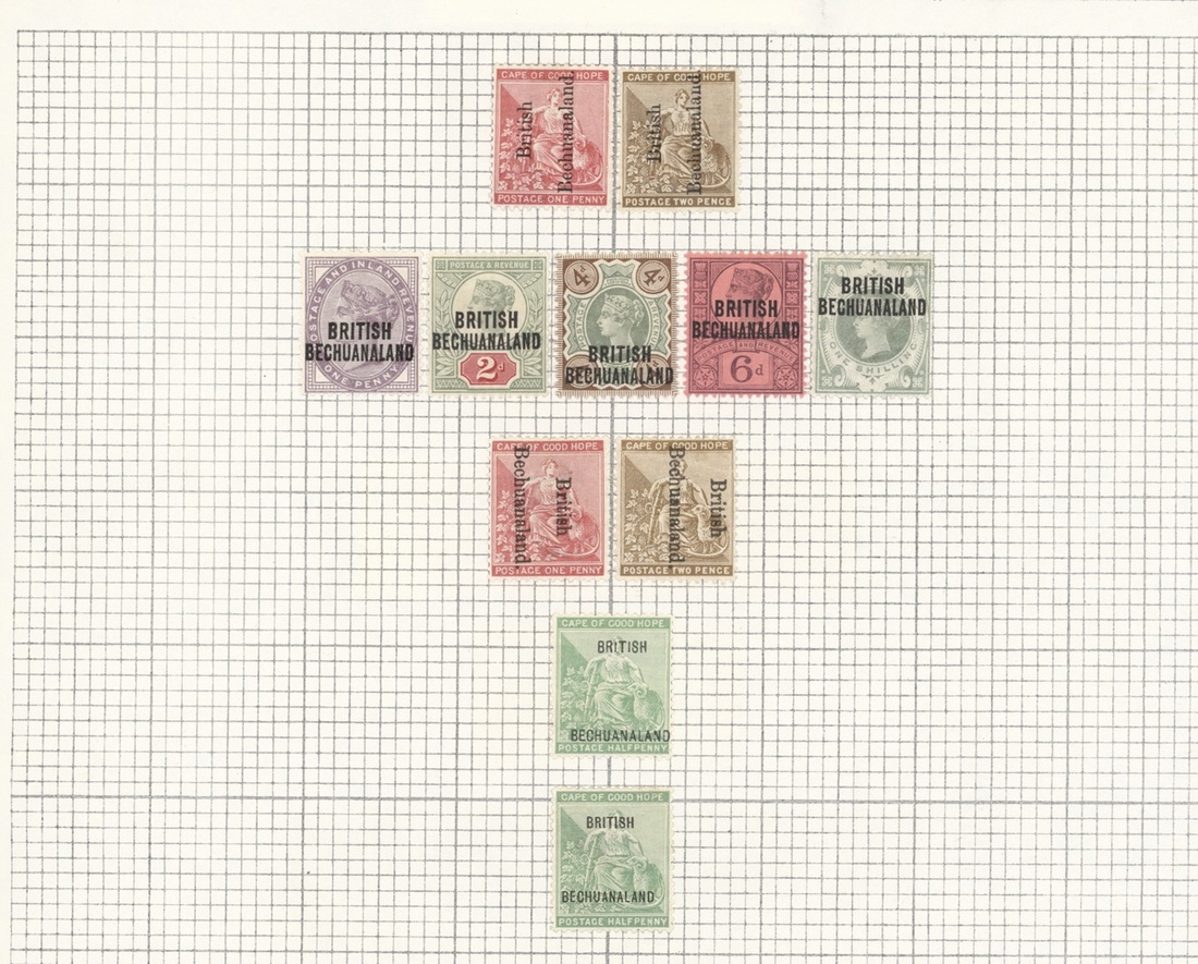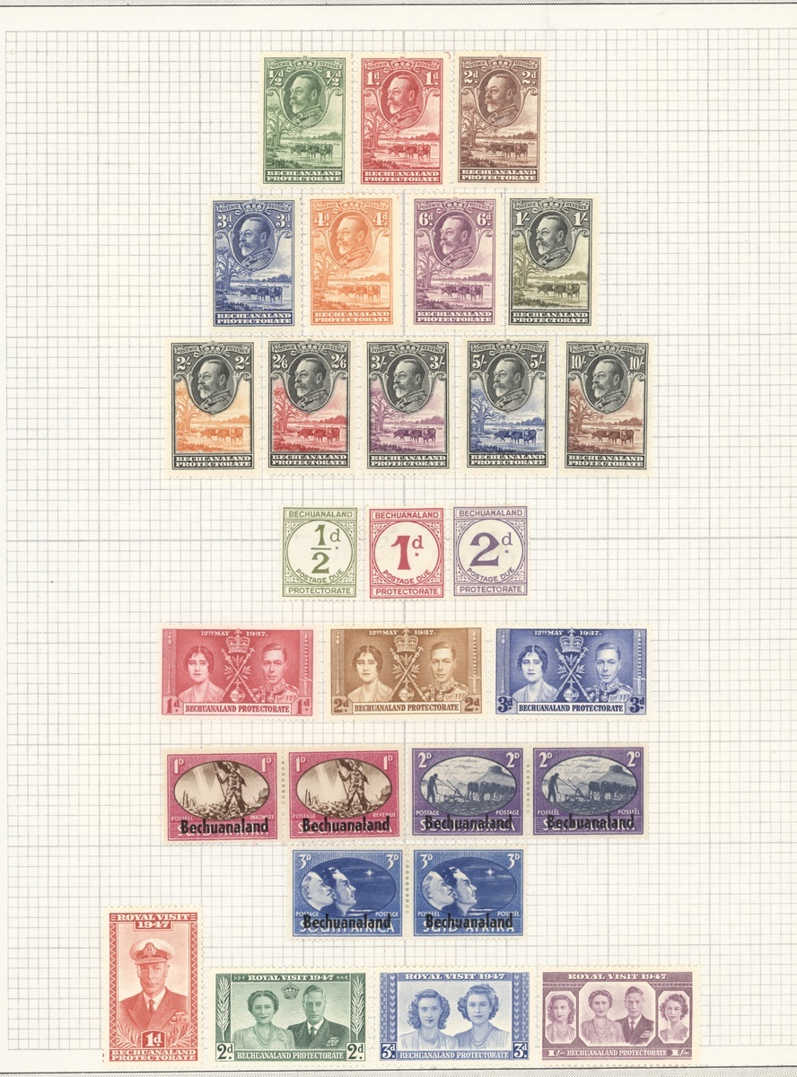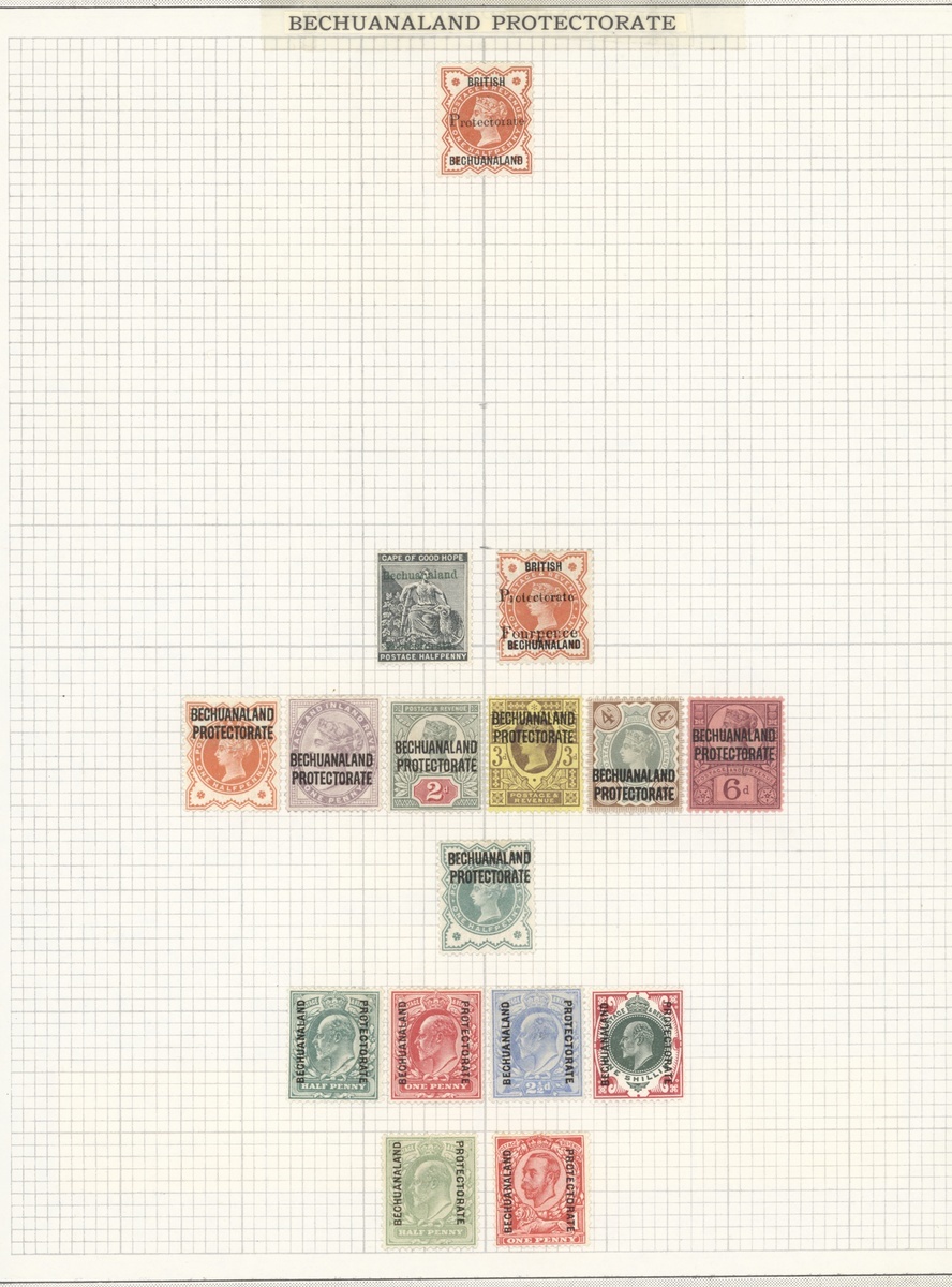 A mint collection with British Bechuanaland 1888 1d. to 10/- and 1891-1904 1d. to 1/- and Bechuanaland Protectorate 1889 (Mar.) 4d. on ½d., 1897-1902 ½d. (both) to 6d., 1904-13 1/-, 1912-14 ½d. to 1/-, 1925-27 ½d. to 1/- (no 1925 6d.), 1932 ½d. to 10/- and 1938-52 ½d. to 10/-, fine. Cat. £1900