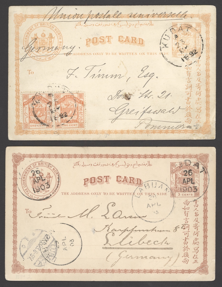 1892 (23 May) 1c. stationery card (central vertical crease) to Germany uprated with 1886-87 1c. pair tied by