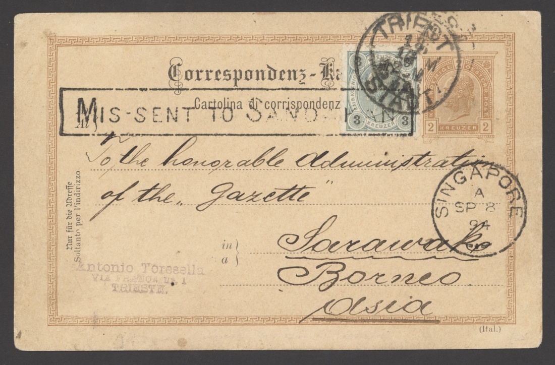 1894 (12 June) Austrian 2kr. stationery card from Trieste to Sarawak, uprated with 3kr., showing Singapore transit c.d.s. (8.8) and extremely rare framed