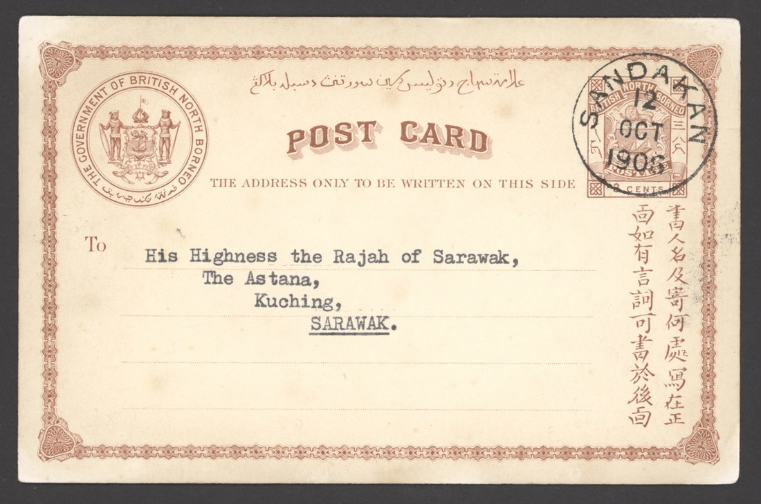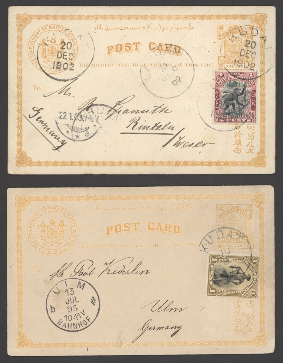 1895 (9 June) 1c. stationery card from Kudat to Germany uprated with 1894 Pictorial 1c. and showing Labuan transit d.s. on reverse; 1902 (20 Dec.) 1c. stationery card from Kudat to Germany, uprated with 1901 4c. and showing Labuan transit d.s.; and 1906 (12 Oct.) 2c. stationery card from Sandakan addressed to the Rajah of Sarawak at Kuching
