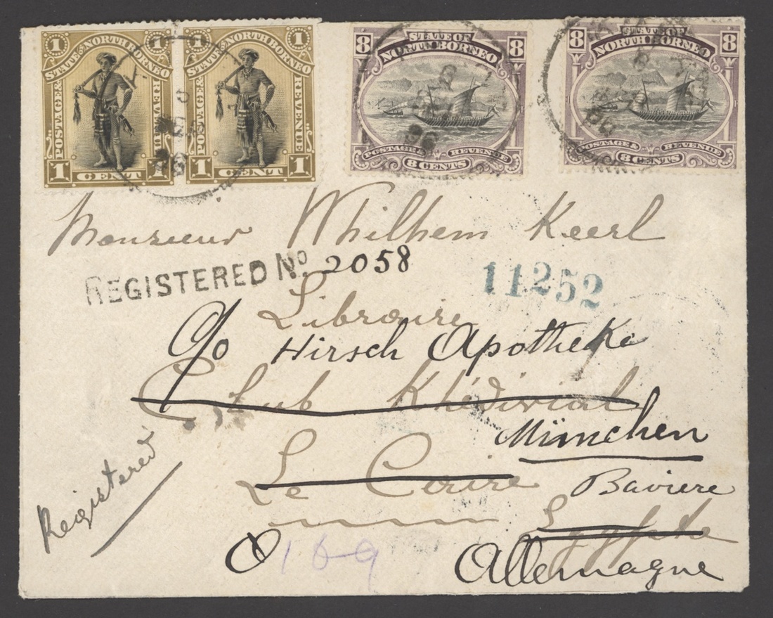 1896 (Sept.) envelope registered from Kudat to Cairo and re-addressed to Munich, bearing 1894 Pictorial 1c. pair and 8c. (2) tied by legible c.d.s., showing fine straight-line