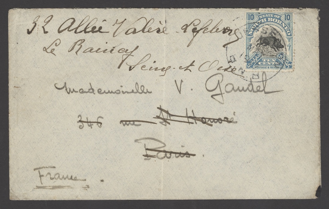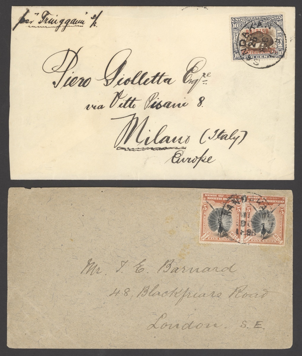 1898-1908 envelopes from Sandakan to London, Jesselton to Paris and redirected internally (heavy central vertical fold) and from Sandakan to Milan, each franked at 10c.