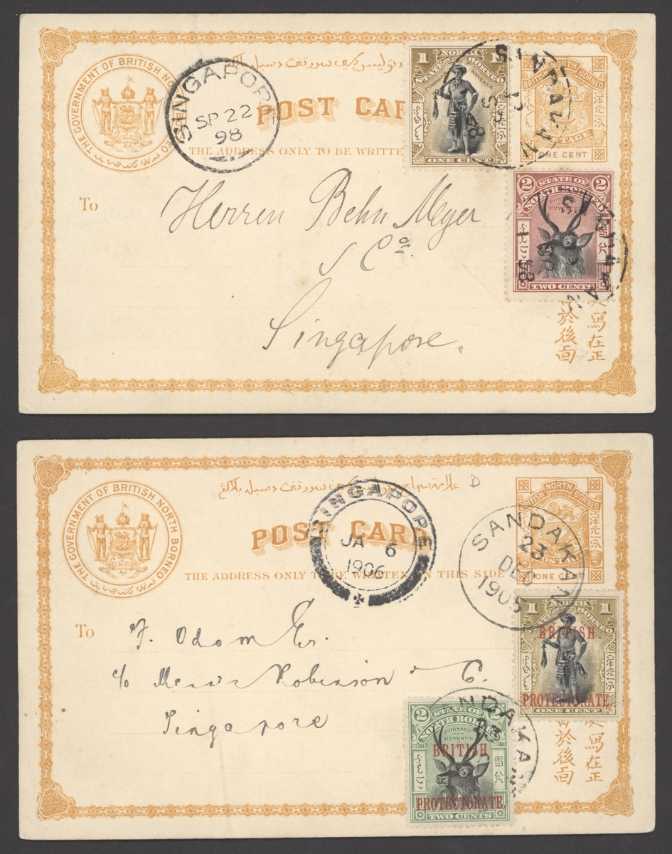 1898 (12 Sept.) 1c. stationery card to Singapore, uprated with 1897 Pictorial 1c. and 2c., all cancelled by Sandakan c.d.s. and showing arrival datestamp (22.9) at left; and 1905 (23 Dec.) 1c. stationery card (creased) from Sandakan to Singapore and uprated with 1901 1c. and 2c.