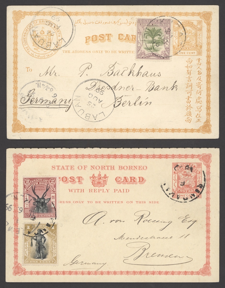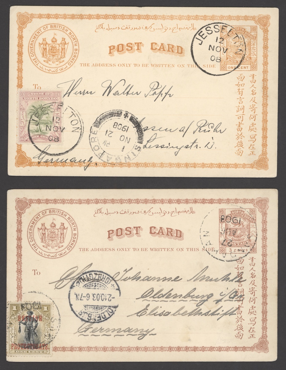 1899-1908 1c. (2), 1c. reply paid and 3c. stationery cards from Jesselton, Kudat and Sandakan (2) to Germany, all uprated to 4c., fine