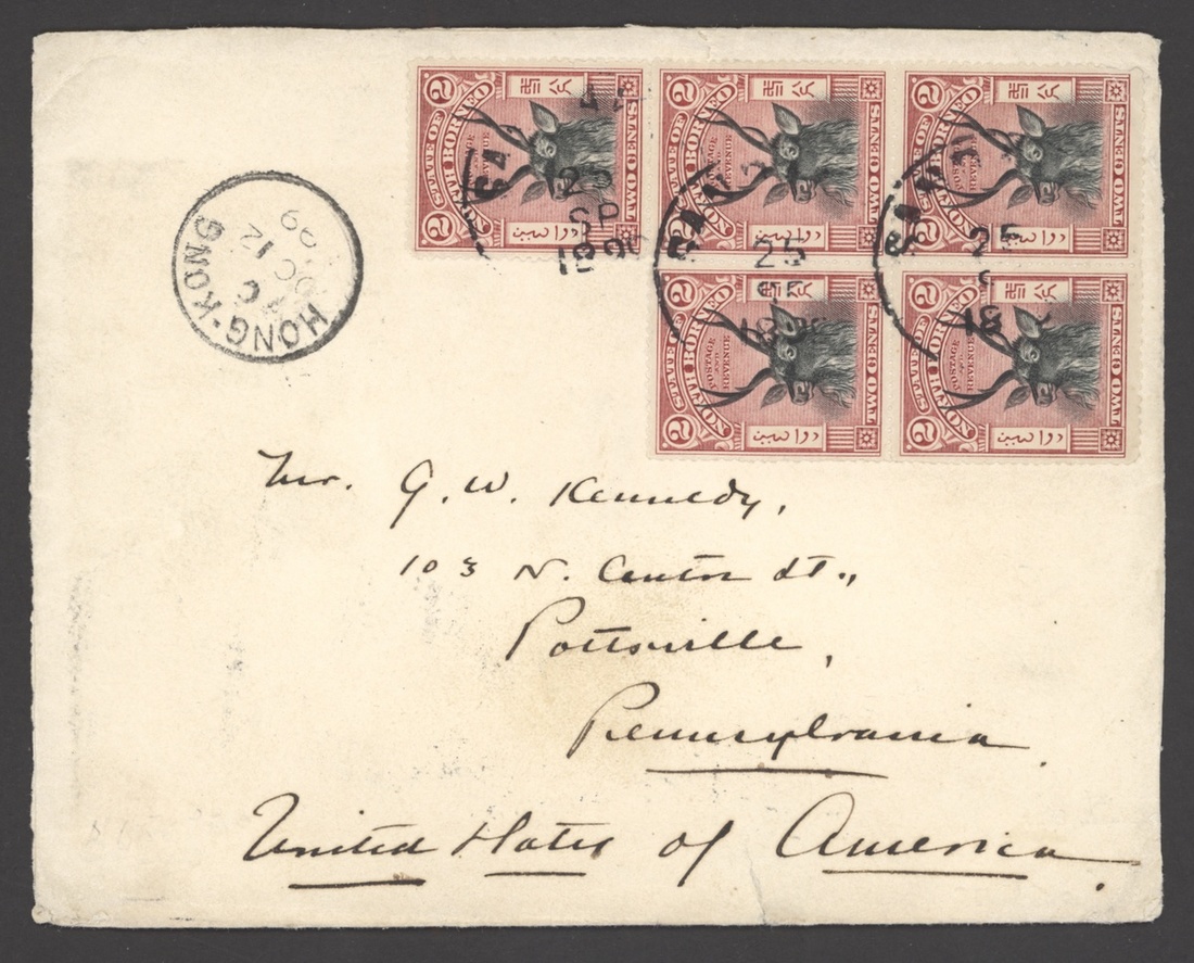 1899 (25 Sept.) envelope (small tear at foot) from Sandakan to USA, bearing 1897 Pictorial 2c. block of five cancelled by c.d.s. and showing Hong Kong transit c.d.s. (12.10) alongside