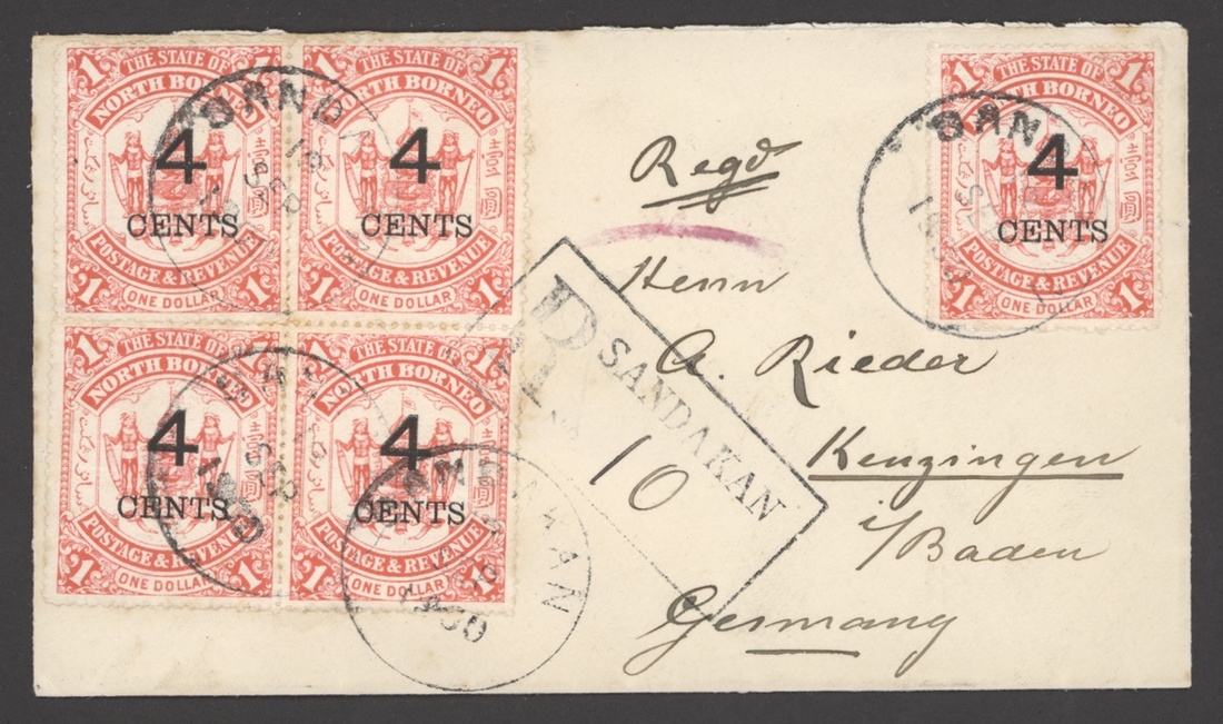 1900 (Sept.) envelope registered from Sandakan to Germany, bearing 1895 4c. on $1 block of four and single tied by c.d.s., showing registration h.s. with, on reverse, Brindisi and arrival datestamps