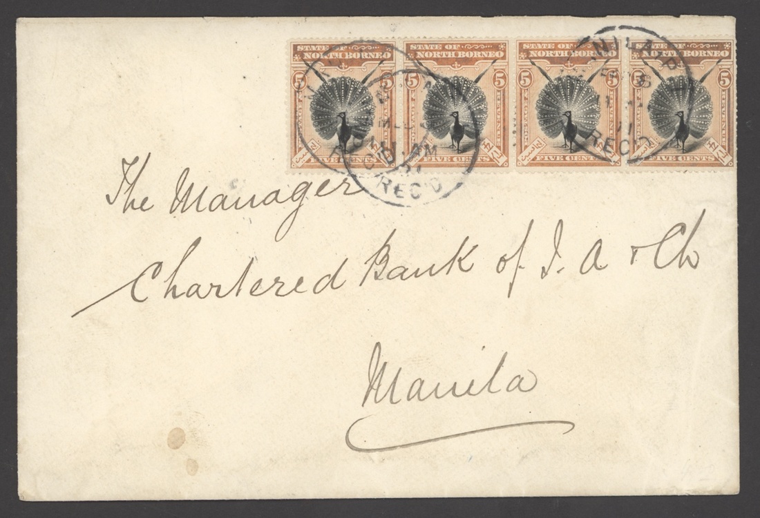 1901 envelope to Manila bearing 1897 Pictorial 5c. strip of four tied by arrival c.d.s. (8.2). Most unusual