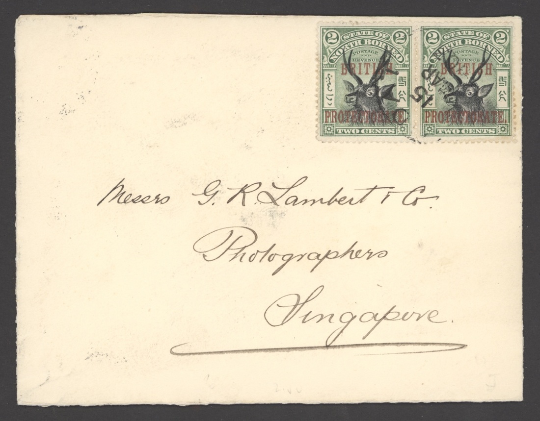1903 (15 Mar.) envelope from Lahat Datu to Singapore, bearing 1901 2c. pair tied by legible c.d.s. and showing, on reverse, Labuan and arrival datestamps. A neat commercial franking