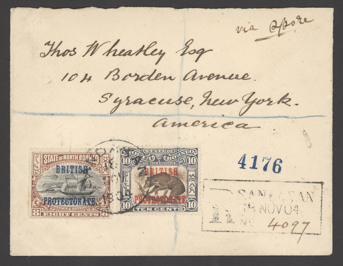 1904 (18 Nov.) Wheatley envelope registered from Sandakan to New York, bearing 1901 8c. and 10c. clearly tied by c.d.s., showing registration d.s. with, on reverse, Singapore, London and arrival datestamps