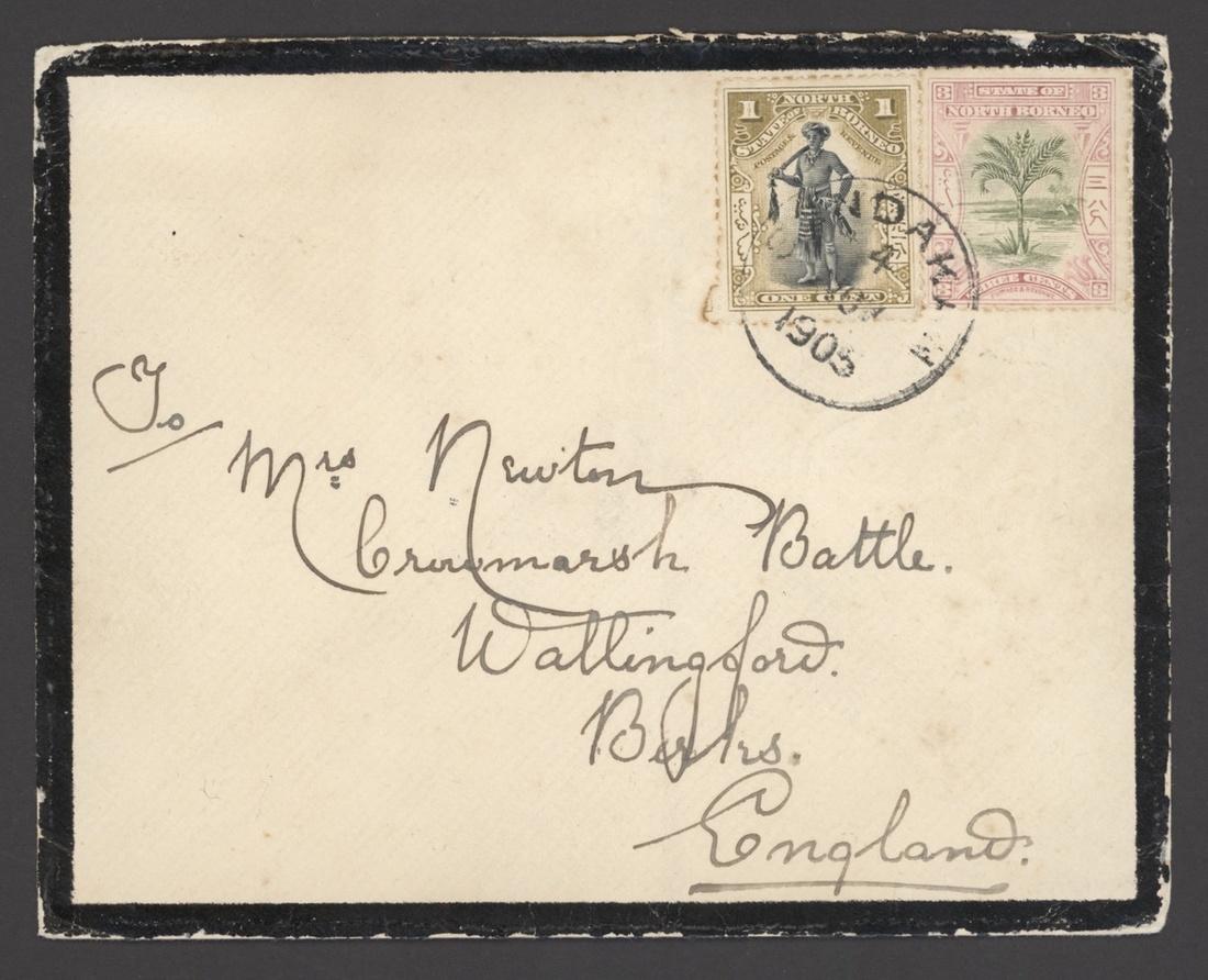 1905 (4 Nov.) mourning envelope from Sandakan to England, bearing 1897 Pictorial 1c. and 3c. clearly tied by c.d.s. and showing arrival datestamp on reverse