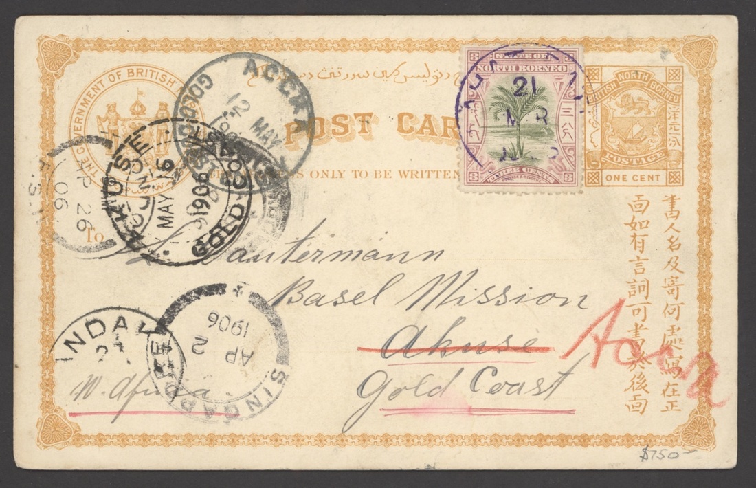 1906 (21 Mar.) 1c. stationery card from Lahat Datu to Akuse, Gold Coast and redirected to Accra, uprated with 1897 Pictorial 3c., cancelled by violet datestamp, showing Sandakan, Singapore, London, Akuse and Accra datestamps. A fine commercial card