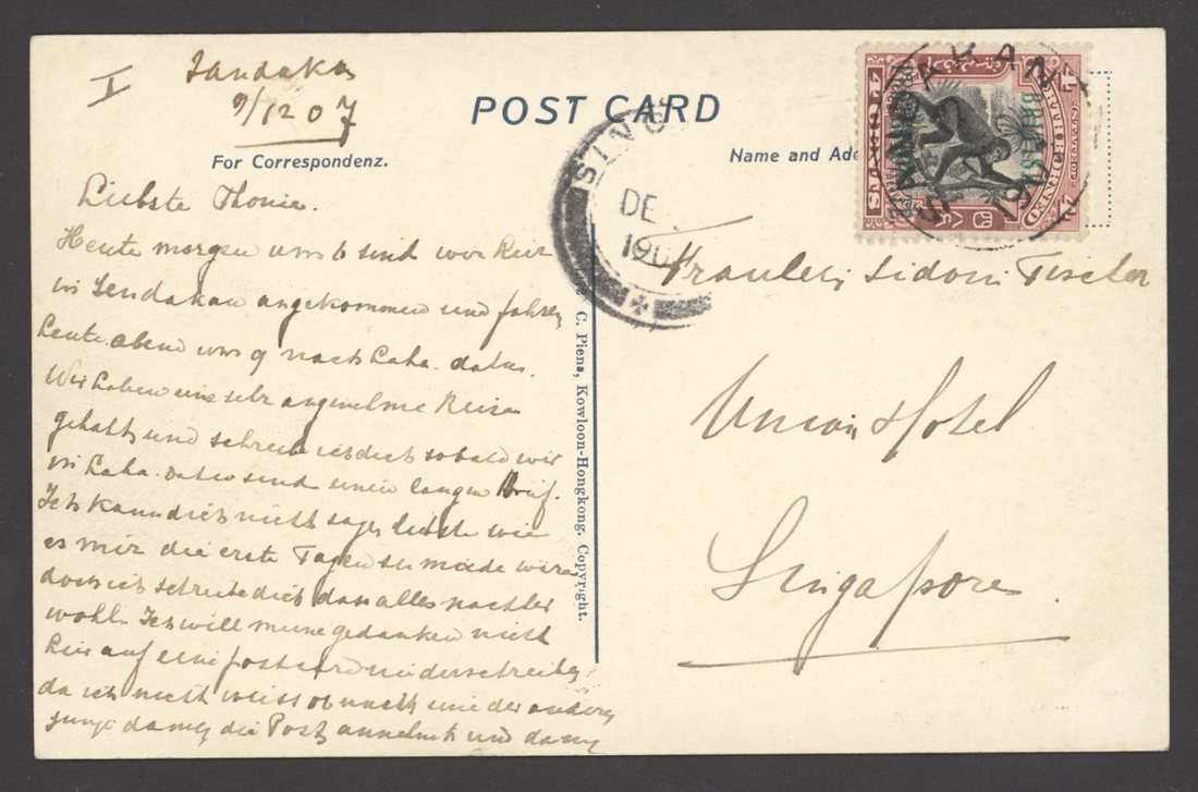 1907-13 picture postcards (3) from Sandakan to USA, each franked at 4c., one with Hong Kong and two with Singapore transit datestamps, fine