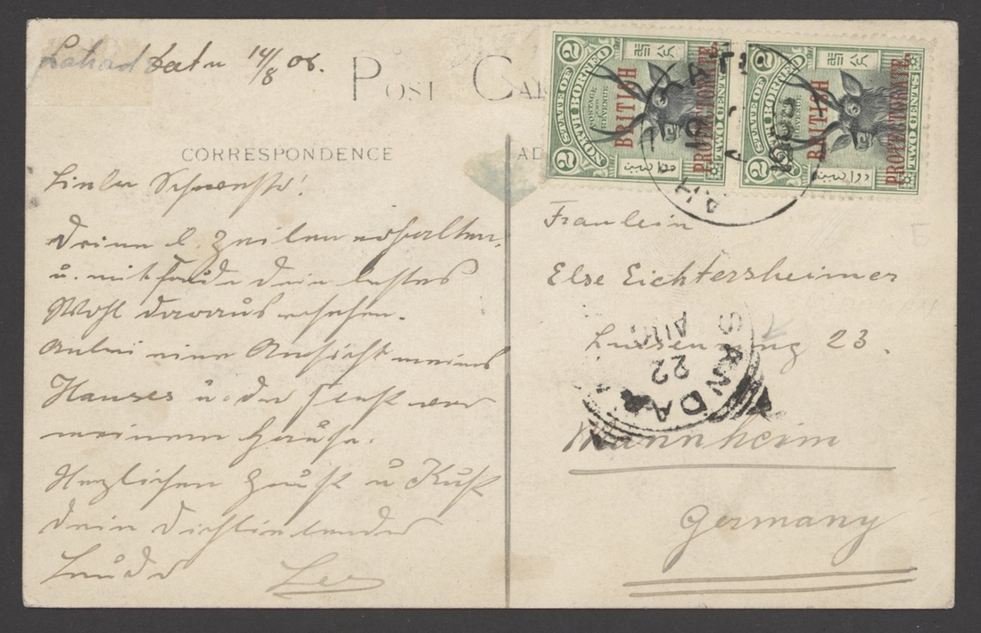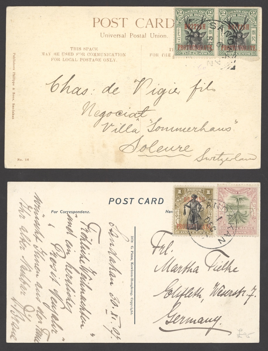 1907-08 picture postcards (3) from Lahad Datu and Sandakan to Germany and from Sandakan to Switzerland, each franked at 4c., fine
