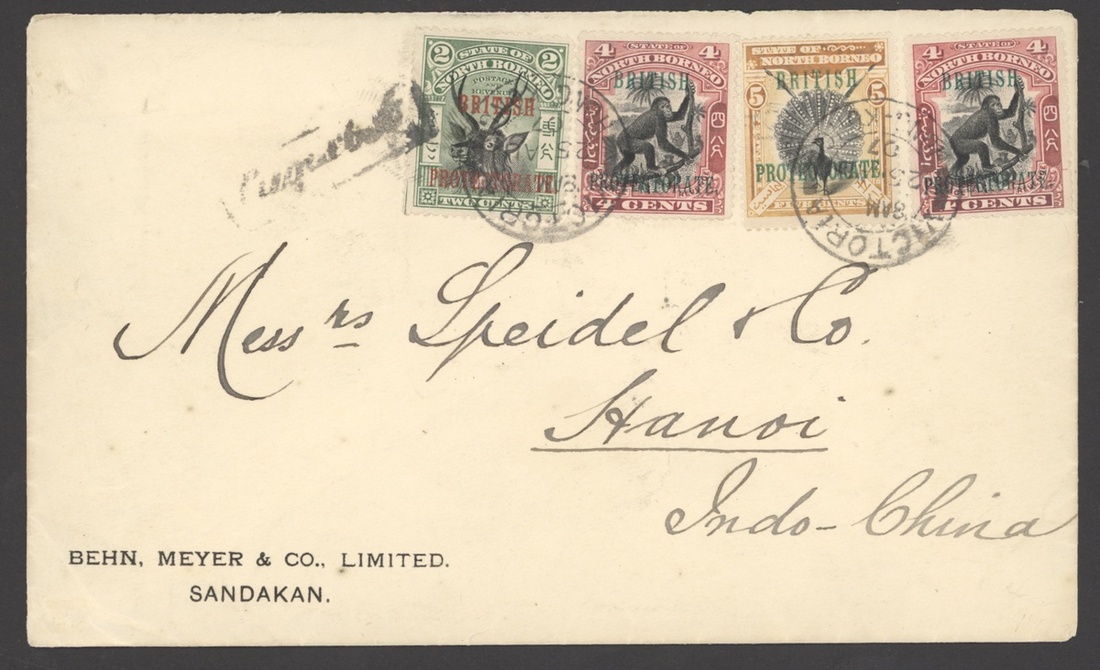 1907 (Aug.) Behn, Meyer & Co. envelope (imprint at lower left) from Sandakan to Hanoi, bearing 1901 2c., 4c. (2) and 5c., all tied by transit