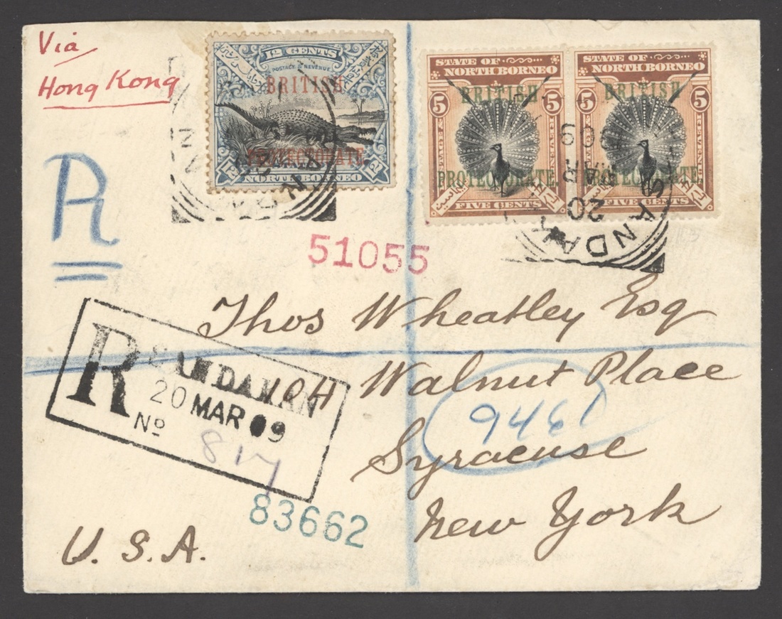 1909 (20 Mar.) envelope registered from Sandakan to New York, marked "Via Hong Kong", bearing 1901 5c. pair and 12c. (some lightly stained perfs) tied by squared-circle d.s. and showing framed registration d.s. with, on reverse, Singapore and arrival datestamps
