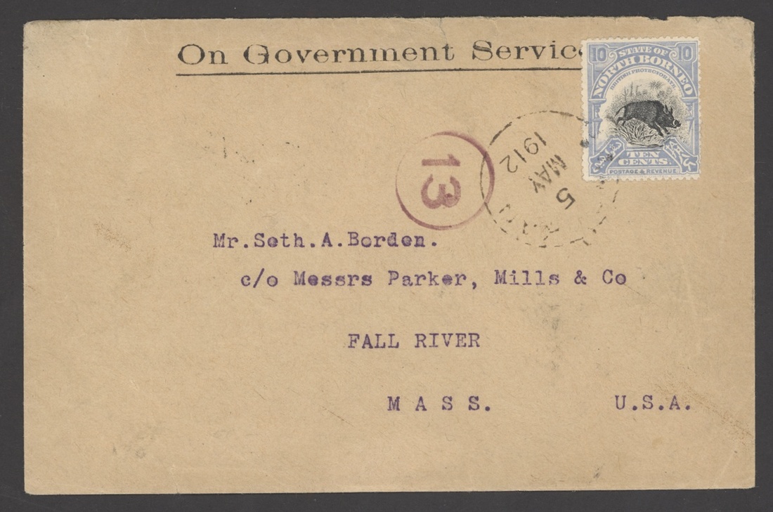 1912 (5 May) "On Government Service" envelope to USA, bearing 1909 Pictorial 10c. tied by unclear c.d.s. and showing, on reverse, Hong Kong transit d.s. (12.5)