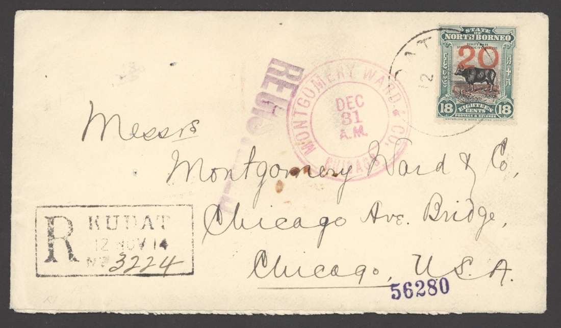 1914 (12 Nov.) Montgomery Ward envelope registered from Kudat to Chicago, bearing 1909 20c. on 18c. tied by c.d.s., showing framed registration d.s., firm's arrival datestamp in red and, on reverse, Singapore (10.11) and New York (20.12) transit datestamps