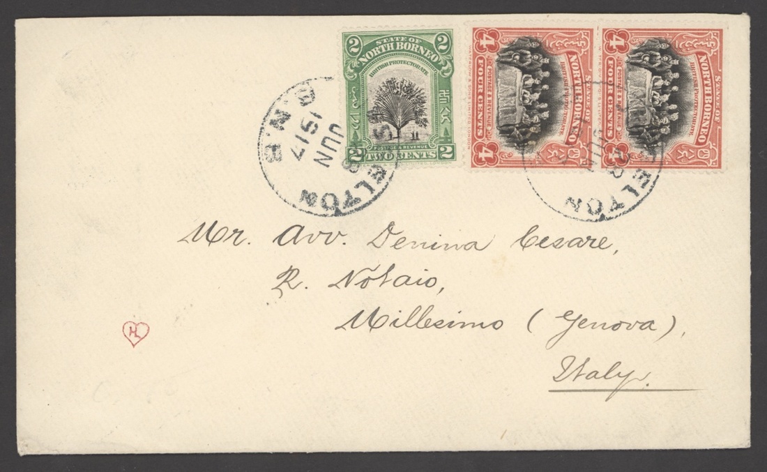 1917 (28 June) envelope from Jesselton to Italy, bearing Pictorial 2c. and 4c. vertical pair and showing Singapore transit c.d.s. (7.7) on reverse. A neat and attractive franking
