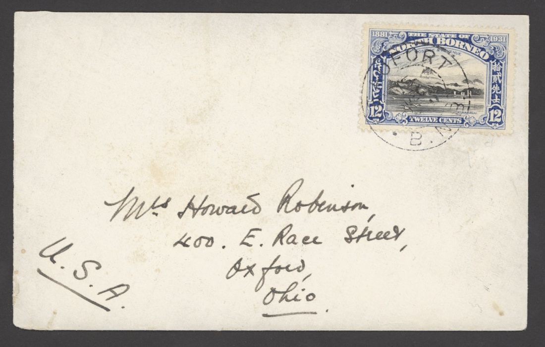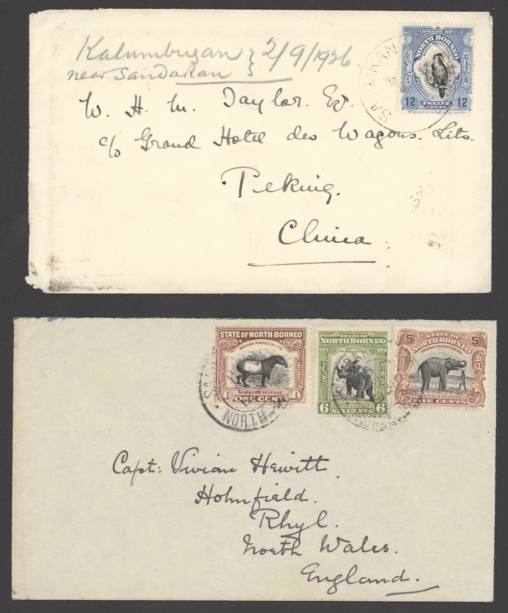 1926 (Sept.) envelope from Sandakan to Peking, 1931 envelope from Beaufort to USA, 1935 (7 Feb.) envelope from Jesselton to Bandjermasin (south-east corner of Dutch Borneo), 1935 (10 Apr.) envelope (tear through back panel) from Sandakan to Manila and another envelope from Sandakan to England, each franked at 12c. A good group of covers