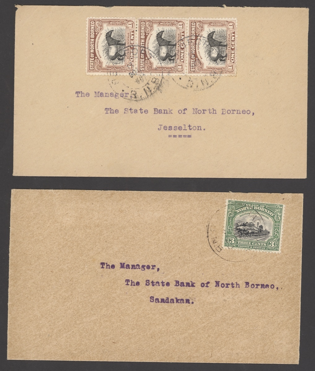 1929-31 envelopes (3) from Beaufort to Jesselton (2) and Lahad Datu to Sandakan, each franked at 3c., fine