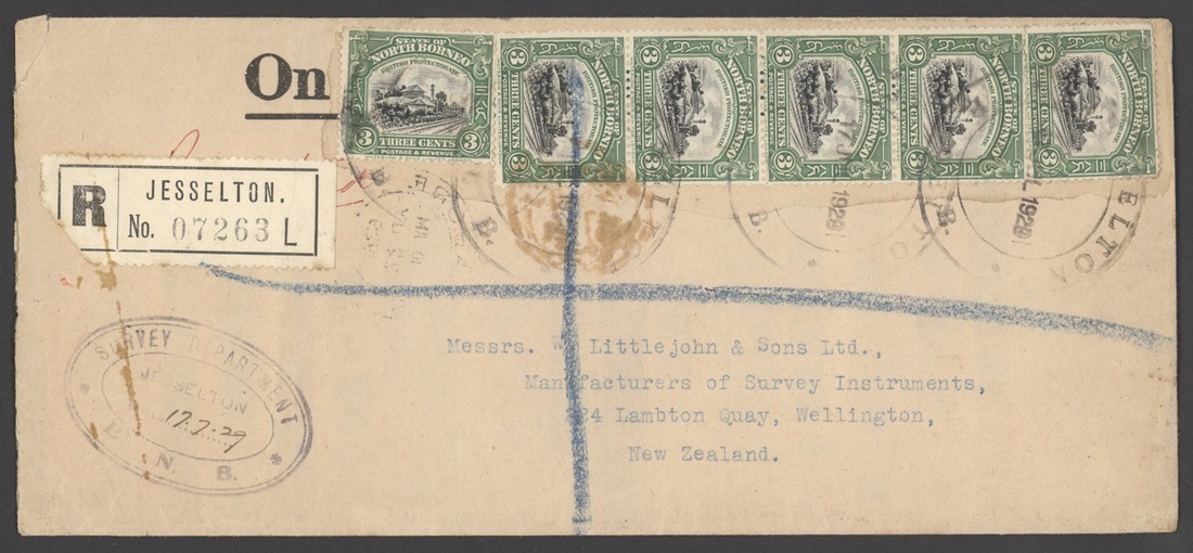 1929 (17 July) double rate Official envelope (230x102mm.) registered from Jesselton to New Zealand, bearing 1925-28 3c. (6) all tied by large