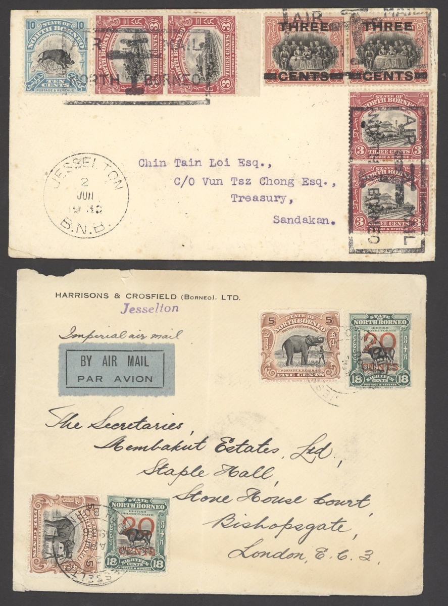 1930 (2 June) envelope from Jesselton to Sandakan, bearing 1923 3c. on 4c. pair and 1925-28 Pictorial 3c. vertical pairs (2) and 10c., all tied by framed