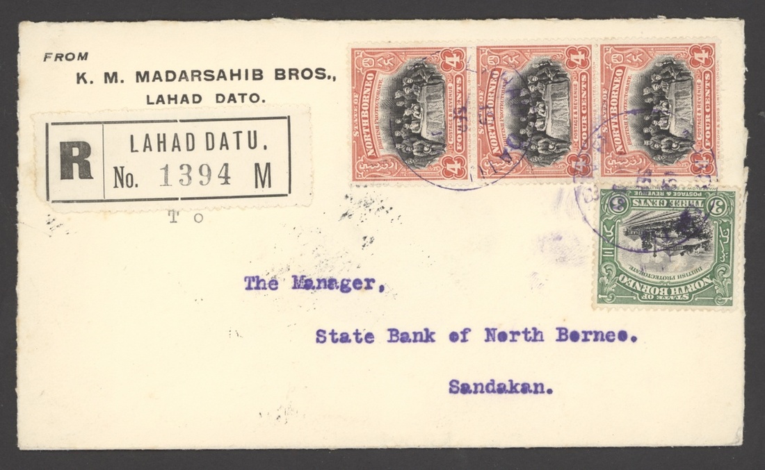 1930 (19 Sept.) envelope registered from Lahad Datu to Sandakan, bearing 1925-28 Pictorial 3c. and 4c. vertical strip of three, all clearly tied by c.d.s. and showing registration label lettered "M"; the envelope with seal cut away on reverse