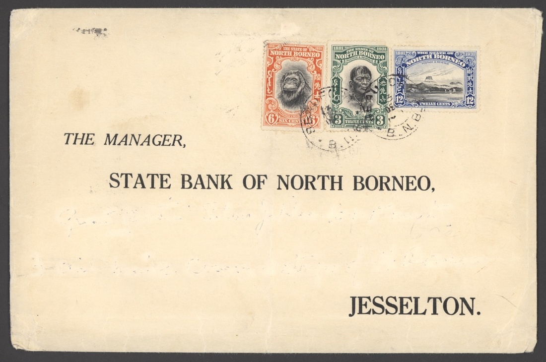 1931 (Dec.) Bank of North Borneo envelope (234x152mm.; a little soiled and creased) from Beaufort to Jesselton, bearing 1931 Pictorial 3c. (blunt corner), 6c. and 12c. tied by legible c.d.s. and showing arrival datestamp on reverse