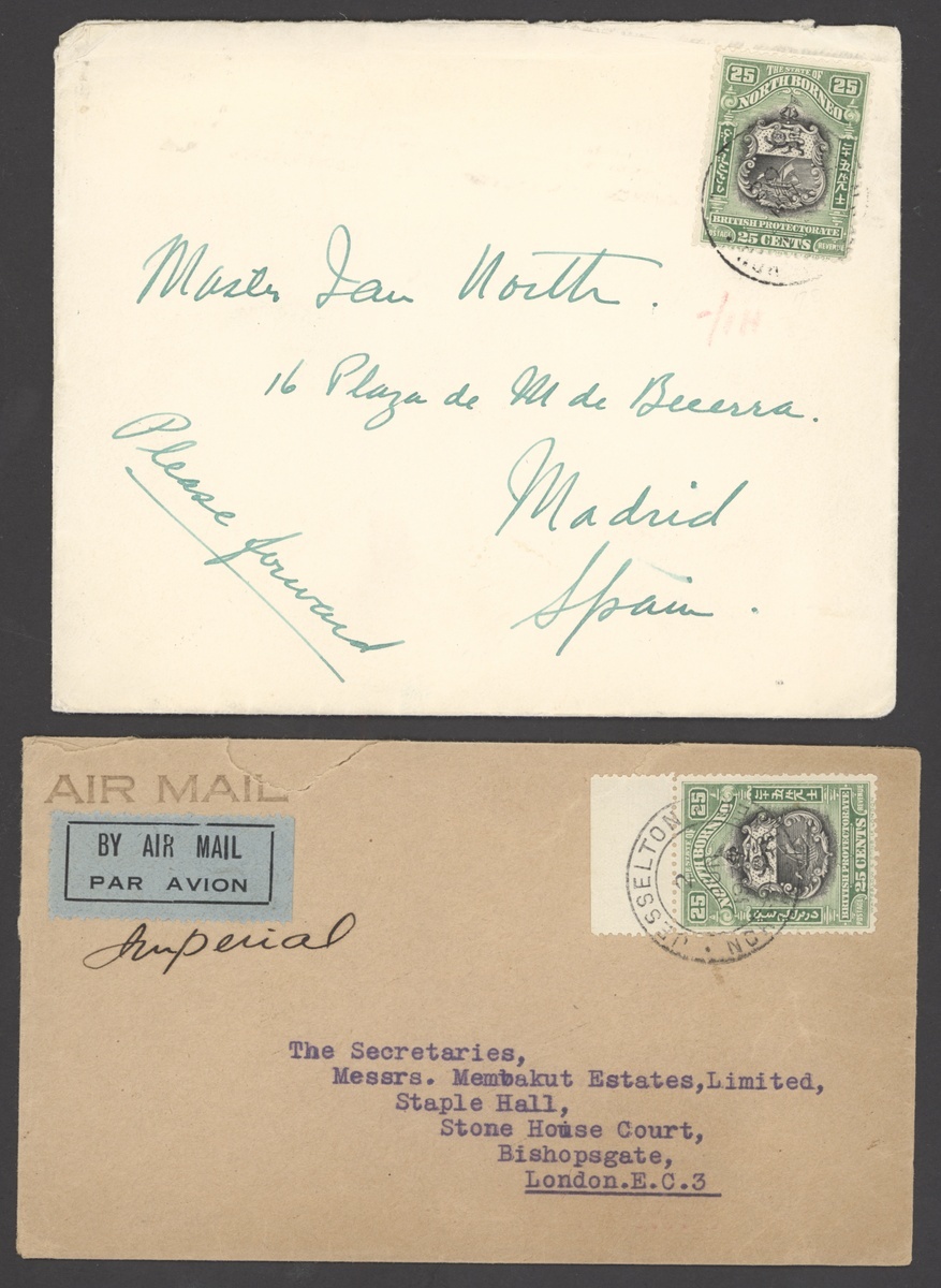 1934 envelopes (2) flown by Imperial Airways to London and Madrid, both bearing 1925-28 25c., one cancelled by clear Jesselton c.d.s., the other with unclear datestamp