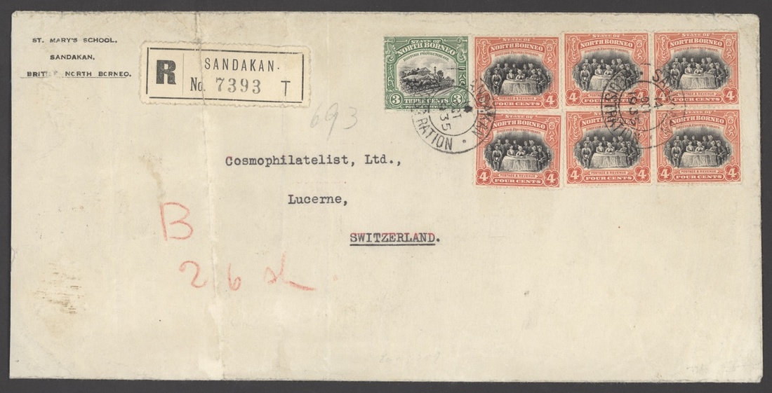 1935 (14 Oct.) envelope (263x123mm.) registered from Sandakan to Switzerland, bearing 1925-28 Pictorial 3c. and 4c. (6) cancelled by clear c.d.s., showing registration label lettered "T" (crossed by vertical crease) with Singapore and arrival datestamps on reverse
