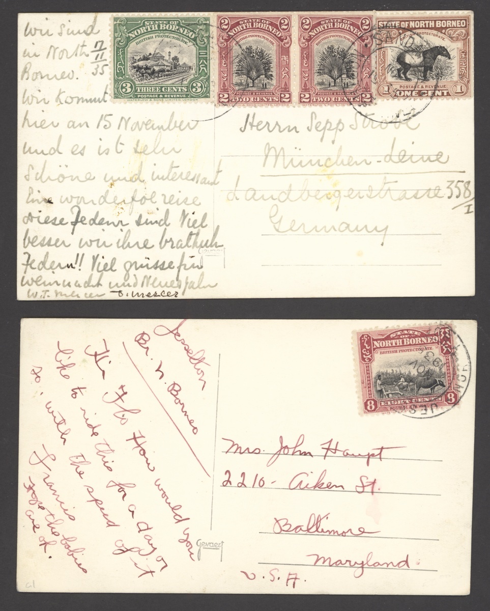 1935 (Nov.) photographic postcards (2) to Germany and USA from Sandakan and Jesselton respectively, both franked at 8c., fine