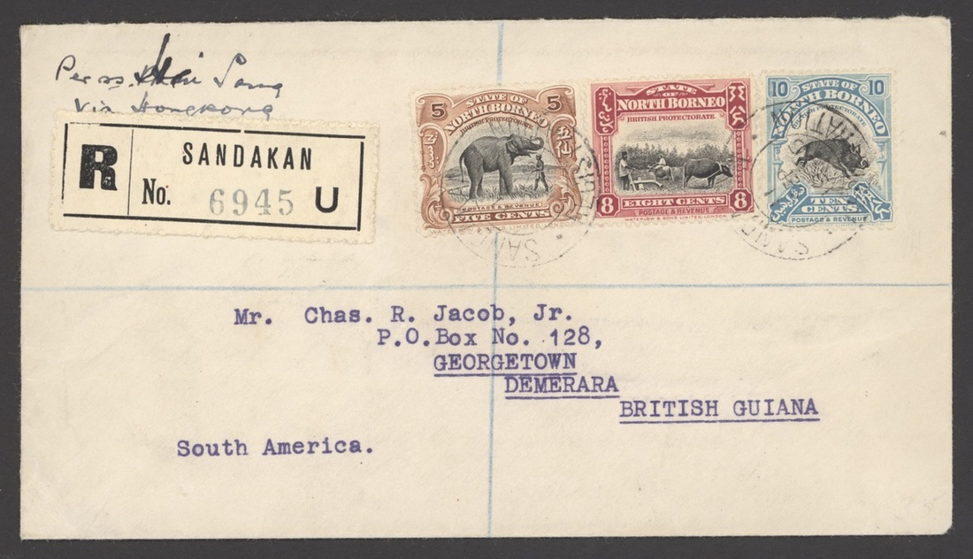 1936 (Sept.) envelope registered from Sandakan to British Guiana, bearing 1925-28 Pictorial 5c., 8c. and 10c., all clearly tied by c.d.s. and showing registration label lettered "U" and, on reverse, Hong Kong (17.9) and arrival (2.11) datestamps. A scarce destination