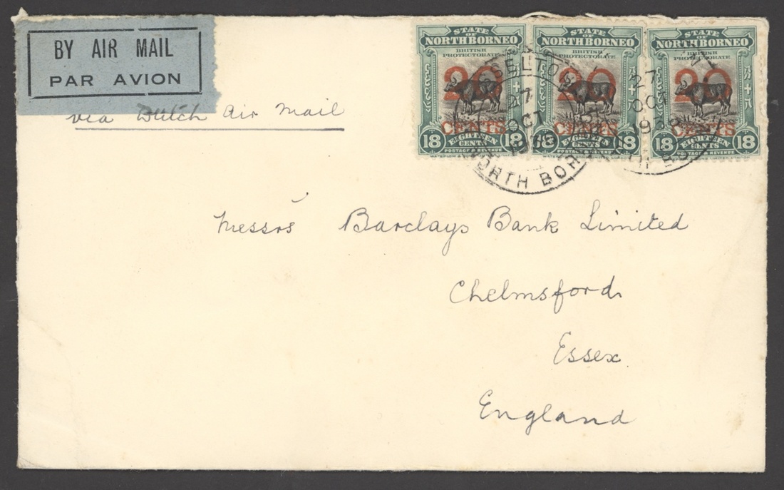 1936 (5 Oct.) envelope from Sandakan to England bearing 1925-28 3c., 8c. (4) and 25c., and (27 Oct.) envelope from Jesselton to England bearing 1925 20c. on 18c. (3), both marked "Dutch Air Mail". Two fine examples of the 60c. rate