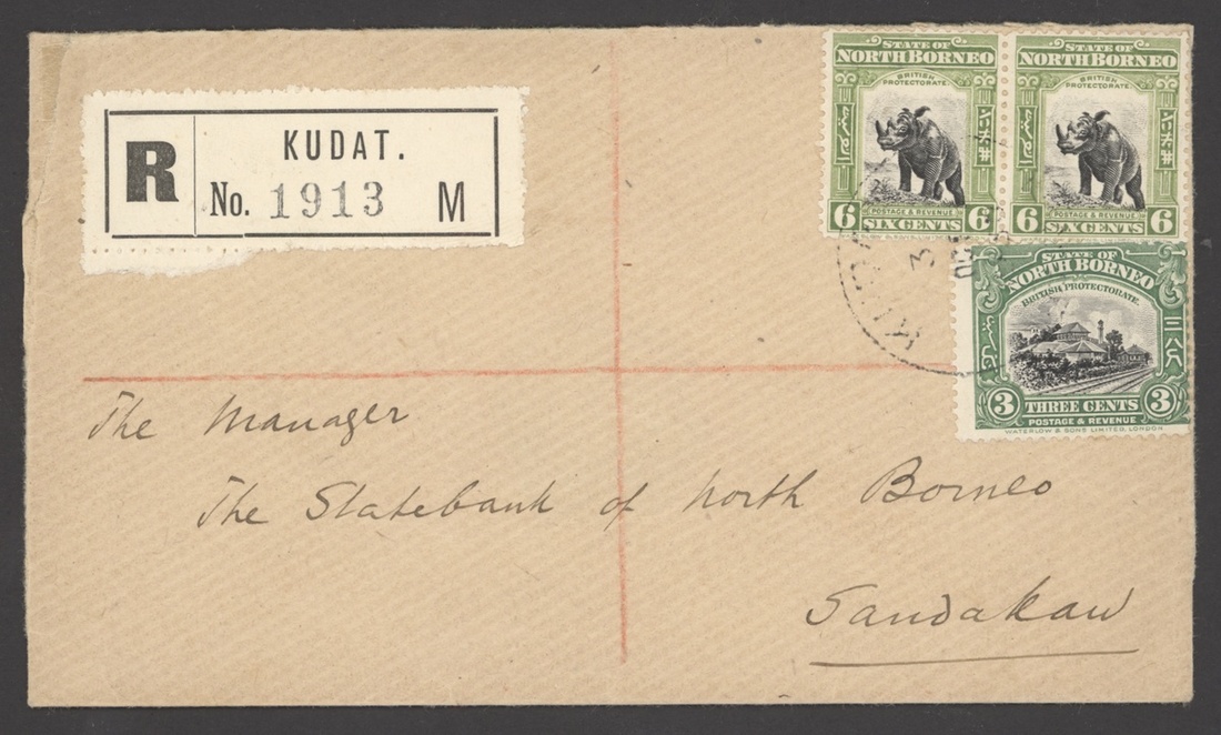 193? envelope registered from Kudat to Sandakan, bearing Pictorial 3c. and 6c. pair tied by light c.d.s. and showing registration label lettered "M". A scarce rate