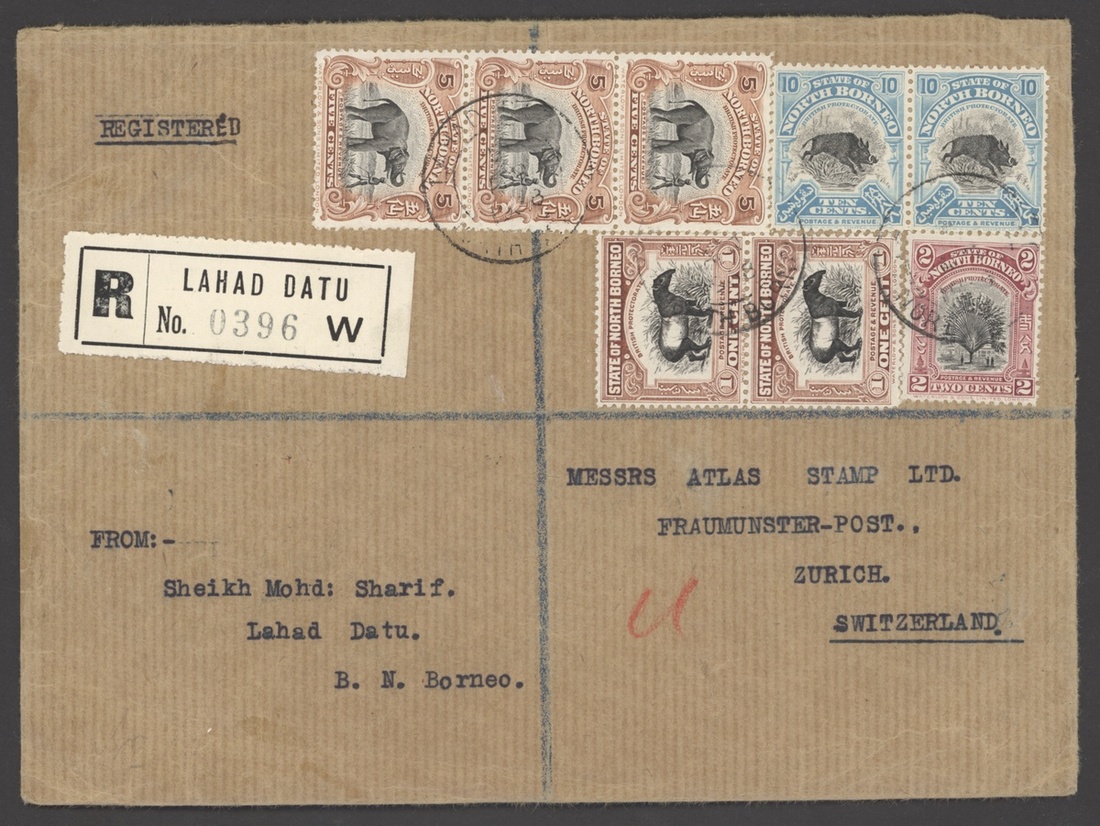 1938 (Apr.) double rate envelope registered from Lahad Datu to Switzerland, bearing 1925-28 Pictorial 1c. vertical pair, 2c., 5c. vertical pair and 10c. pair, all cancelled by unclear c.d.s., showing registration label lettered "W" and, on reverse, Sandakan, Singapore and arrival datestamps. A fine example of the double 12c. foreign letter rate plus 15c. registration fee