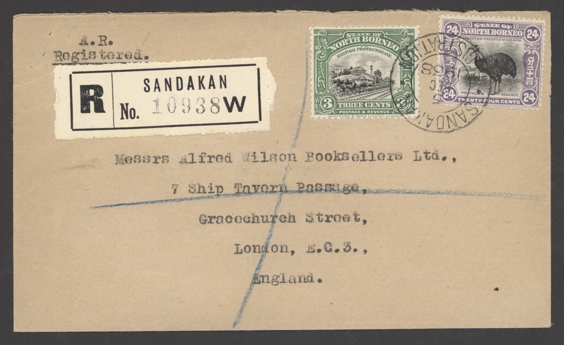 1938 (5 Dec.) envelope registered from Sandakan to London, marked "A.R., Registered", bearing 1925-28 Pictorial 3c. and 24c. clearly tied by c.d.s. and showing registration label lettered "W". A neat and attractive franking