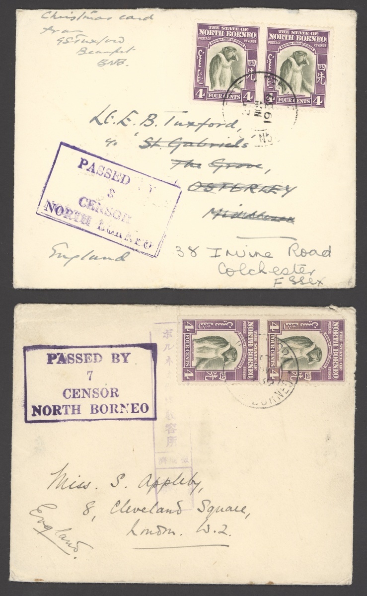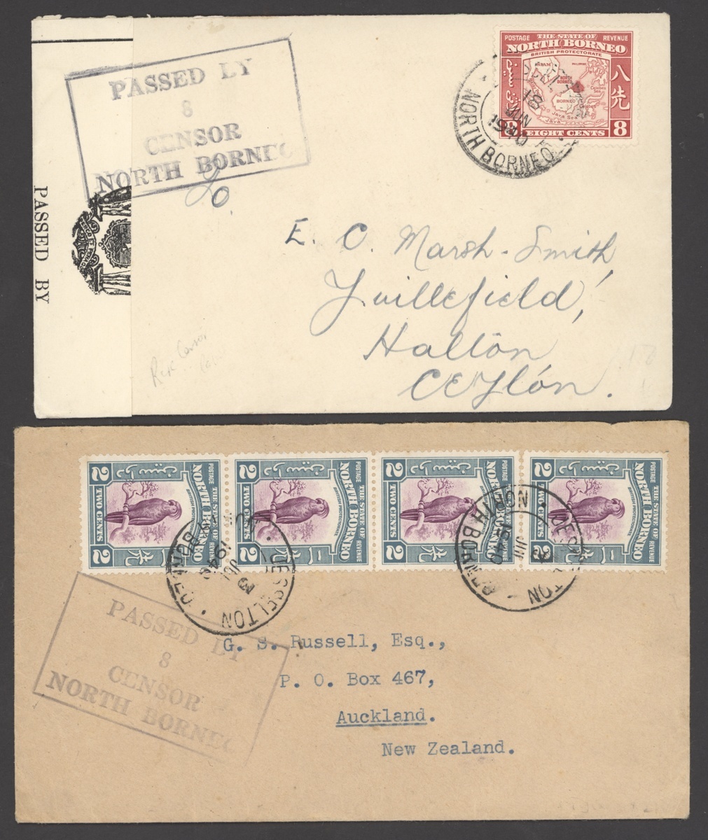 1939-40 envelopes (5) to Ceylon, England (3) and New Zealand, each franked at 8c. and showing framed