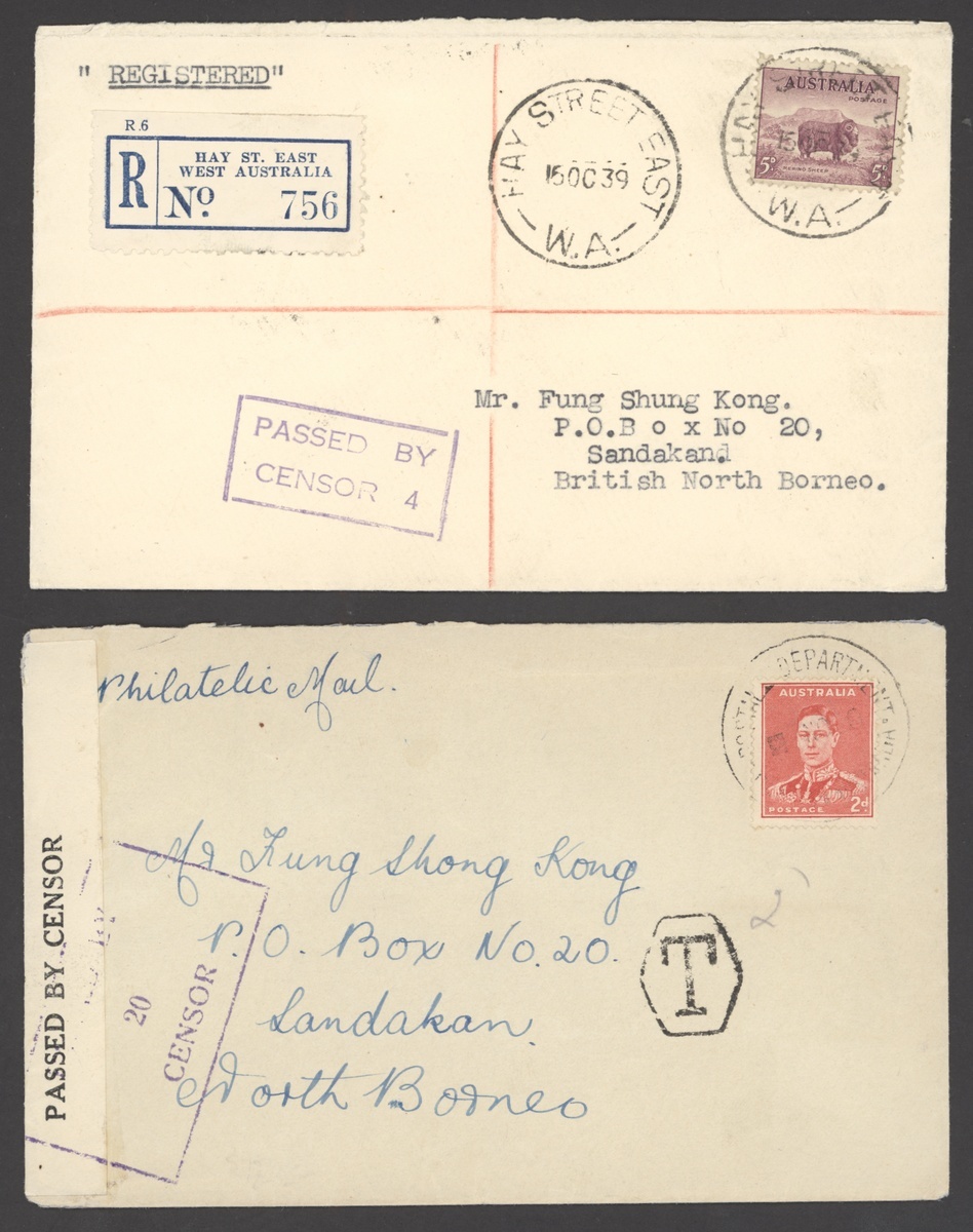 1939 (Oct.) and (Nov.) envelopes registered from Australia to Sandakan, the former franked at 5d. and showing framed