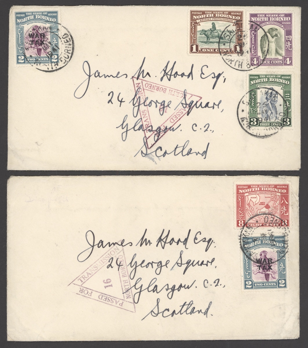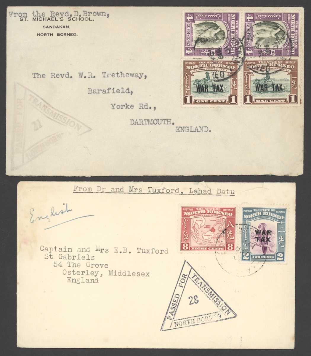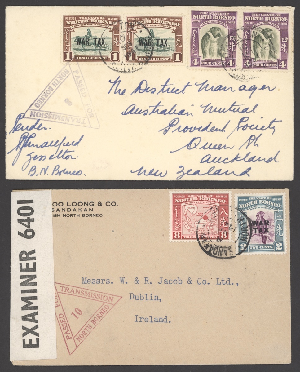 1941 envelopes (7) to Ireland, New Zealand and UK (5), each franked at 8c. plus 2c. War Tax, showing triangular