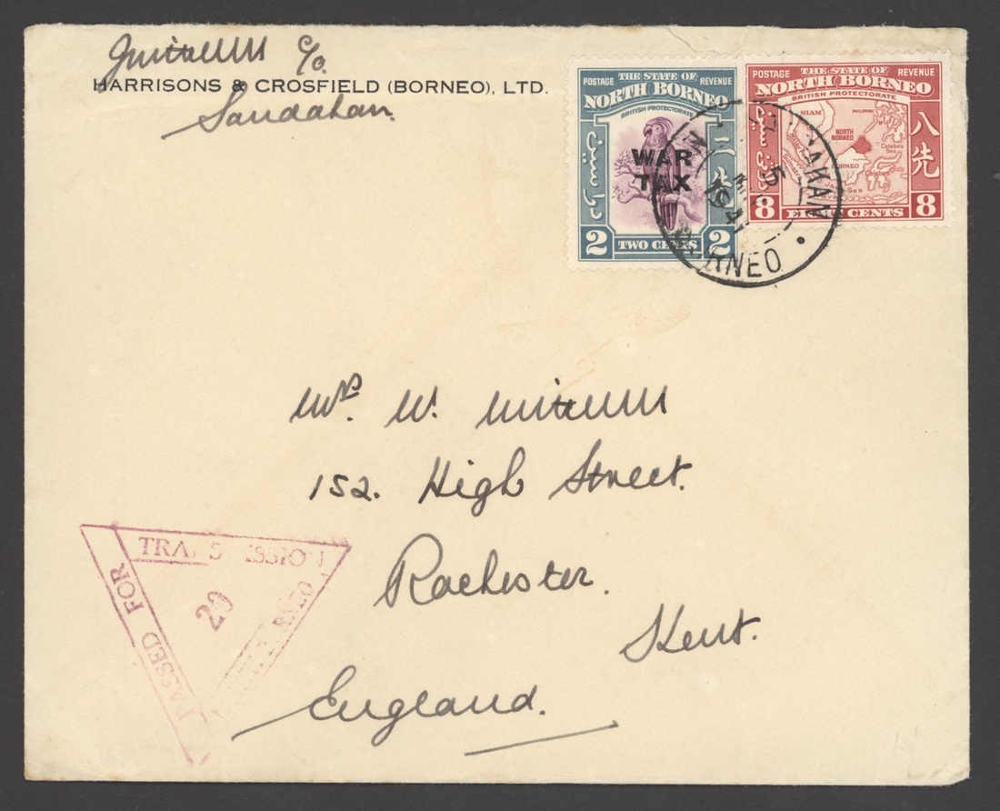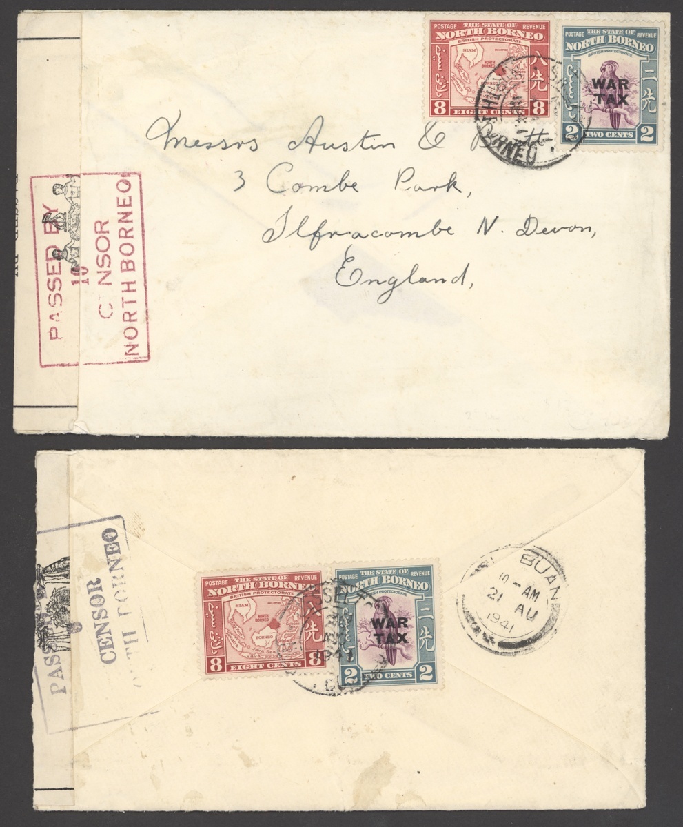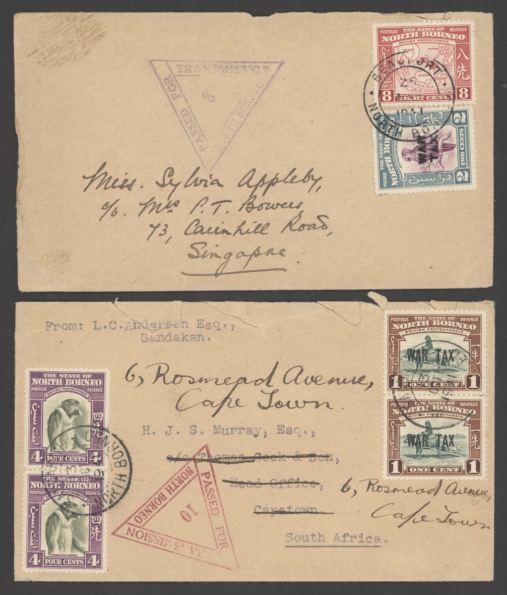 1941 envelopes (5) to England (2), Sarawak, Singapore and South Africa, each franked at 8c. plus 2c. War Tax, showing framed