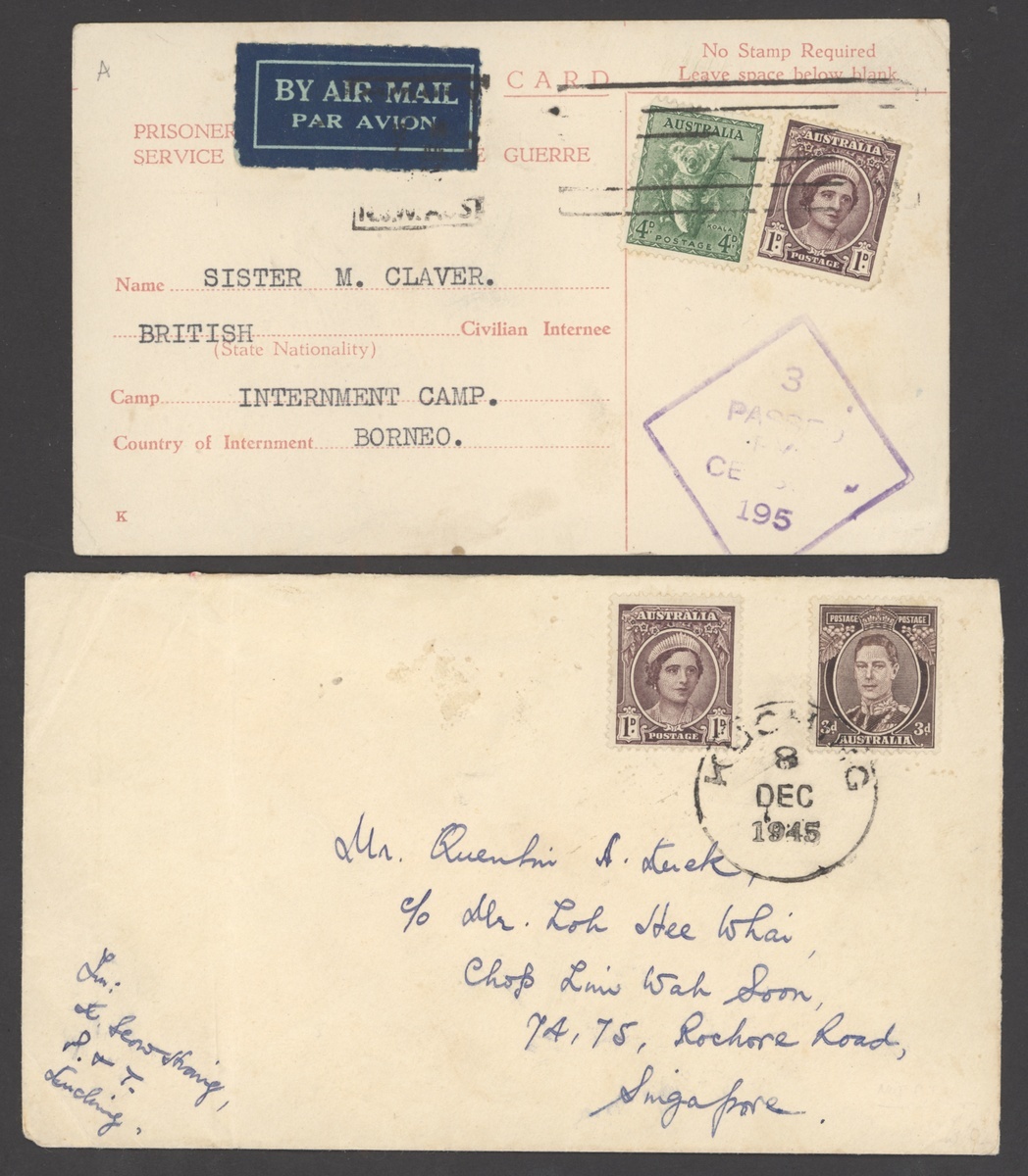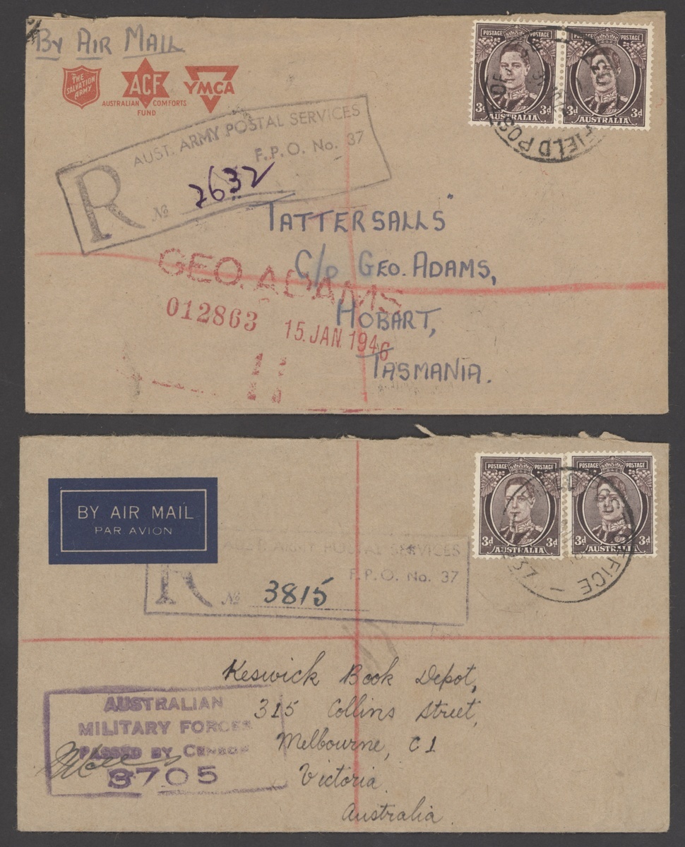 1945 (Aug.) Australia 5½d. uprated with 1d. and 1945 and 1946 (Jan.) envelopes registered and bearing Australia 3d. pair, both addressed to Tasmania, cancelled by