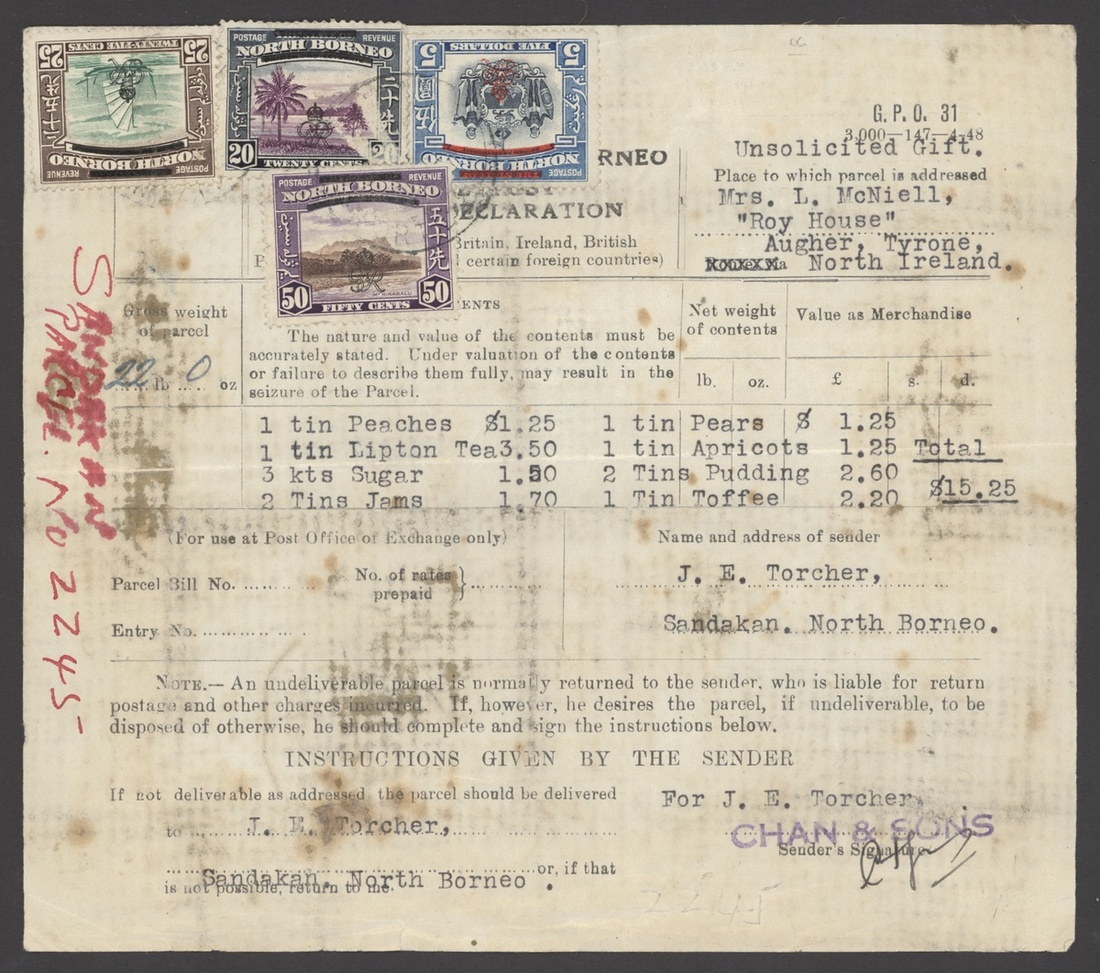 1948 Post Office Parcel Customs Declaration form issued in Sandakan for a parcel going to Northern Ireland, bearing 1947 20c., 25c., 50c. and $5, all cancelled by light and unclear datestamp, some light staining but rare and most unusual