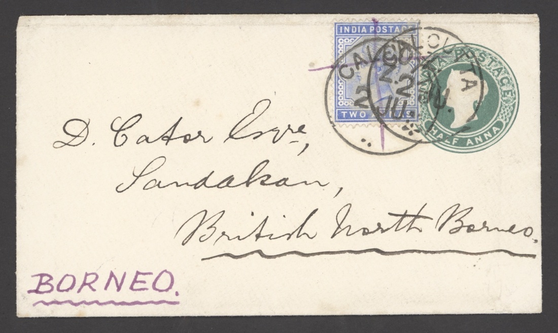 1893 (2 June) India ½a. stationery envelope to Sandakan, uprated with 2a. which is tied by pen cross and Calcutta c.d.s. and showing, on reverse, Singapore (16.6) and arrival (23.6) datestamps