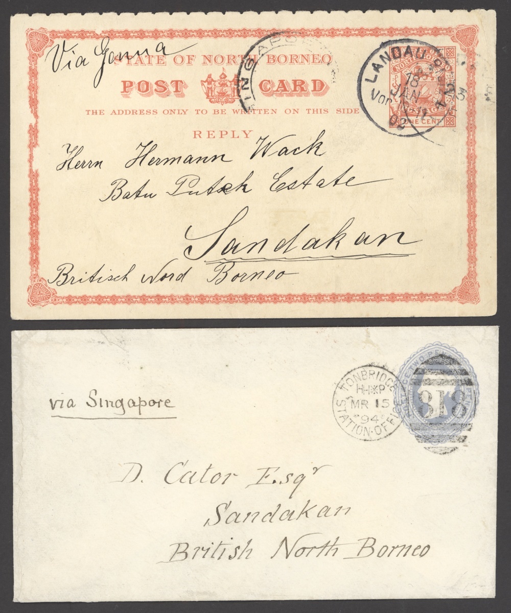 1894 (15 Mar.) GB 2½d. stationery envelope from Tonbridge to Sandakan, cancelled by "818" duplex and showing, on reverse, red arrival datestamp (18.4); and 1902 (18 Jan.) North Borneo 1c. reply half of reply paid card from Germany to Sandakan showing Singapore transit datestamp