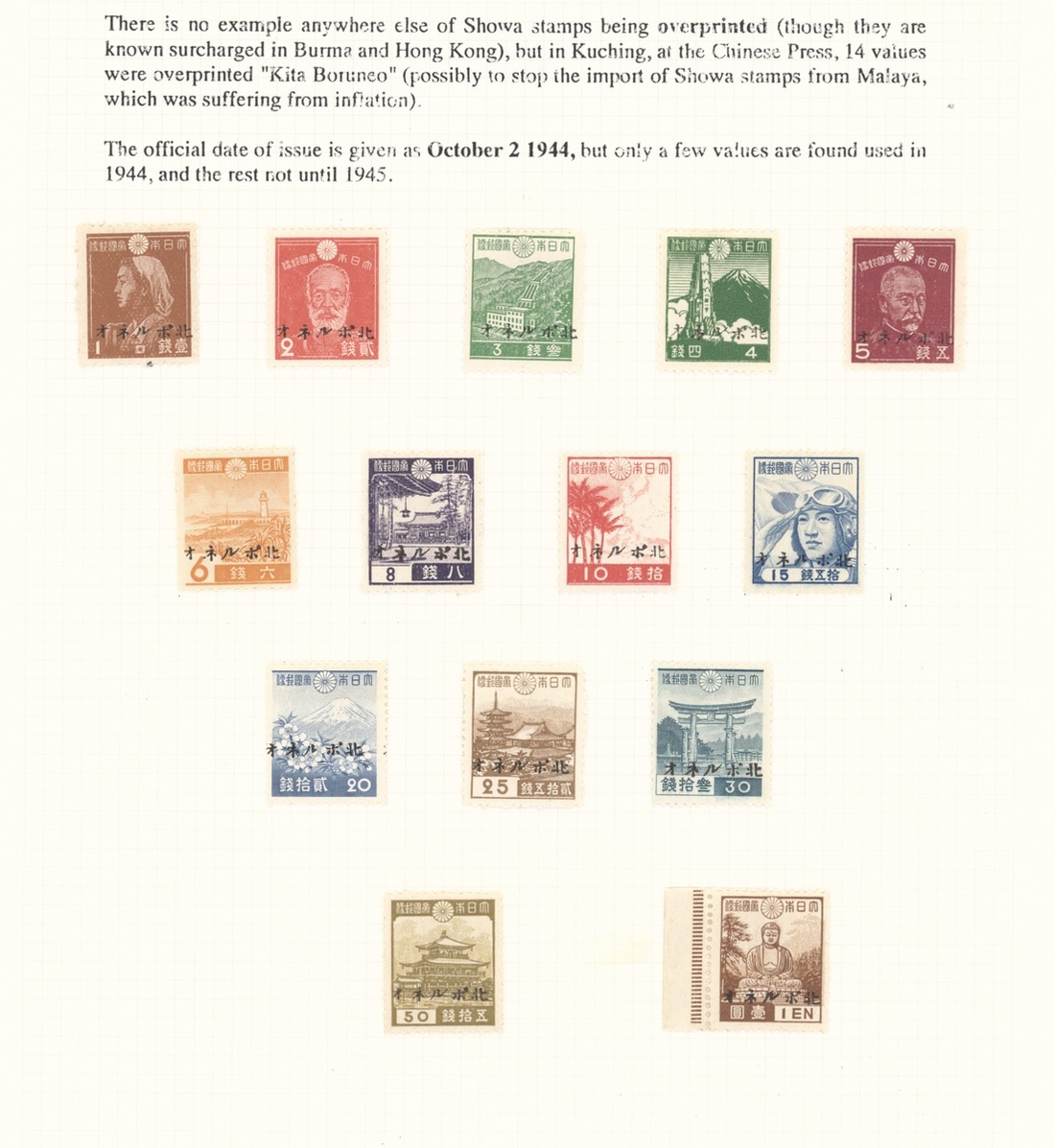 1944 (Sept.) 1c. to $1 set of thirteen (50c. with some stained perf tips at foot) and 1944-45 on Japan 1s. to 1y. set of fourteen, fine mint. S.G. J20-J32, J35-J48, £875