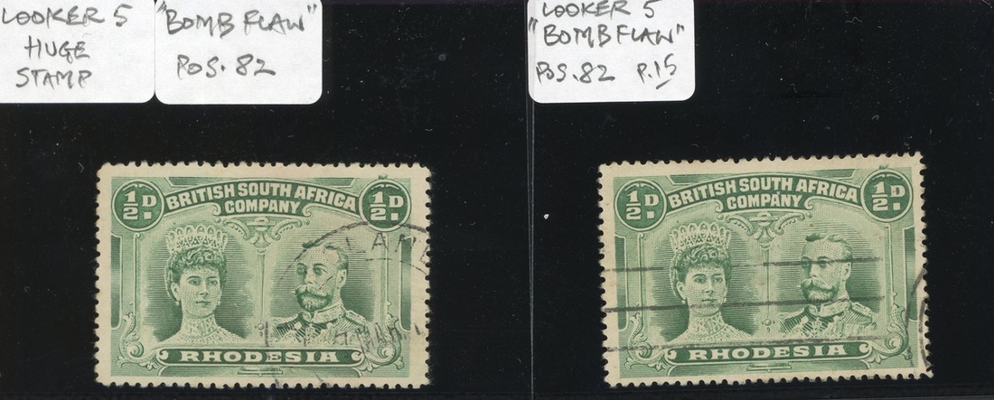 [82], "bomb" flaw, a large example with neat part datestamp, and the same variety on a perf. 15 stamp in a different shade and with machine cancellation; a fine pair