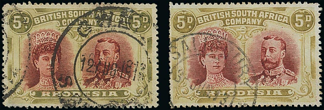 [26] with "button" flaw in it's very final state, large part Gwelo August 1912 datestamp, small fault at lower left, and RSC "C" lake-brown and yellow-olive, Thick Ear printing, [5] with light large part Salisbury 1913 datestamp, a few short perfs. at upper left though a good reference example. An attractive pair of the two perf. 15 printings