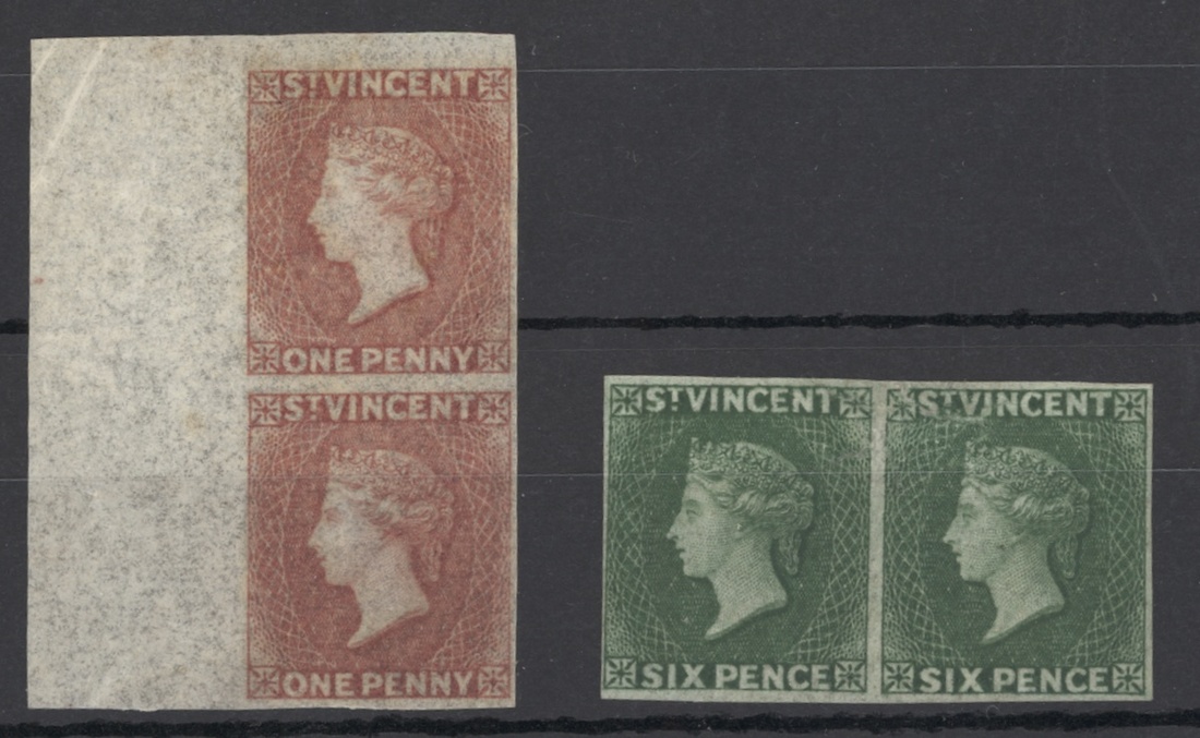 1861 (May) no wmk., 1d. rose-red top left corner vertical pair plus 6d. green horizontal pair, both variety imperforate, the 1d. with light bends and small crease in margin and the 6d. touched at left, otherwise fine with large part original gum. S.G. 1b, £275
