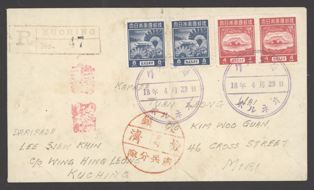 1942 (29 Apr.) envelope registered from Kuching to Miri, bearing North Borneo Pictorial 4c. pair and 8c. (2) clearly tied by Japanese c.d.s. (Type JD1) on day of issue, showing registration h.s. and two different censor chops in red; the envelope a little soiled. A very scarce franking